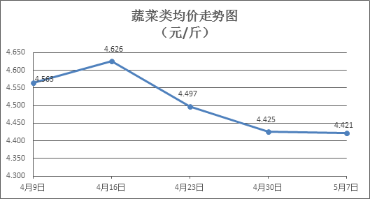 据本市21家农贸市场监测数据显示,上周(4月30日至5月7日,下同)市场上各类“菜篮子”商品供应充足,所监测的7大类“菜篮子”商品价格1涨4跌2平。其中:粮油类商品价格基本平稳,肉禽蛋类、水果类商品价格略有下降,蔬菜类、水产类商品价格升降互现。随着“五一”节后市场消费将有所降温,加之当前雨水天气较多,预计近期市场上肉禽类、水果类商品价格将有所回落,蔬菜、水产类商品价格或有小幅上升预期。