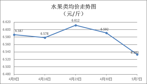水果类商品价格稳中有降。本周所监测的6种水果商品价格波动情况为1涨4跌1平,综合零售均价为6.533元/斤,环比下降0.88%。其中苹果、香蕉、葡萄零售均价分别为每斤7.30元、3.20元、13.17元,环比分别上涨0.14%、下降0.62%、下降1.35%。