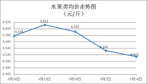水果类商品价格总体略降。上周所监测的6种水果商品价格波动情况为2涨4跌,综合零售均价为6.515元/斤,环比下降0.28%。其中苹果、香蕉、葡萄零售均价分别为每斤7.29元、3.21元、13.16元,环比分别下降0.14%、上涨0.31%、下降0.08%。