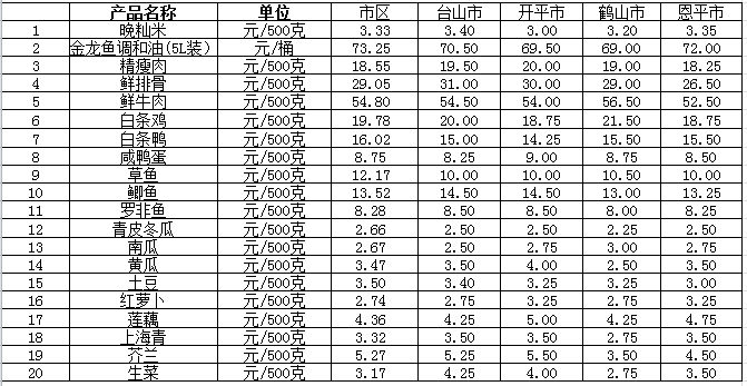 说明:1、表中价格为该地区监测点综合平均价;2、“市区”含蓬江区、江海区、新会区,价格分别采自蓬江市场、江南市场、城东市场等13家农贸市场;3、其他四个县市价格分别采自新华市场、锦江市场等8家农贸市场。