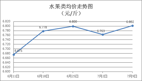 水果类商品价格有所回升。上周所监测的6种水果商品价格波动情况为3涨3跌,综合零售均价为6.802元/斤,环比上涨0.57%。其中苹果、葡萄、梨零售均价分别为每斤7.41元、14.43元、6.54元,环比分别下降0.40%、上涨1.76%、上涨1.71%。