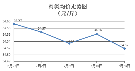 据本市21家农贸市场监测数据显示,上周(7月17日至7月23日,下同)市场上各类“菜篮子”商品供应充足,所监测的7大类“菜篮子”商品价格5跌2平。其中:粮食类、水果类商品价格基本平稳,食用油类、肉禽蛋类、蔬菜类、水产类商品价格总体略降。受高温天气影响,预计近期部分肉禽类商品需求减少价格下降,其他商品价格小幅波动。