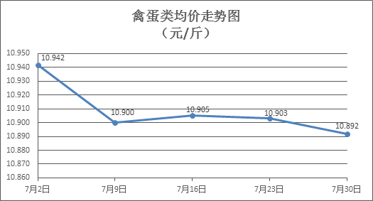 禽蛋类商品价格微幅盘整。上周所监测的6种禽蛋类商品价格波动情况为3涨3跌,综合零售均价为10.892元/斤,环比下降0.11%。其中:白条鸡、白条鸭零售均价分别为每斤19.67元、15.40元,环比分别下降0.71%、上涨0.26%;白壳鸡蛋、鸭蛋零售均价分别为每斤6.62元、7.93元,环比分别上涨0.15%、下降0.13%。
