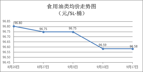 食用油类商品价格稳中微降。上周所监测的9种食用油(5L装)商品价格波动情况为3涨5跌1平,综合零售均价为96.58元/桶,环比下降0.01%。其中:鲁花花生油、金龙鱼调和油零售均价分别为每桶156.91元、70.89元,环比分别下降0.22%、上涨0.14%。