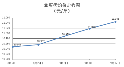 禽蛋类商品价格略有上涨。上周所监测的6种禽蛋类商品价格波动情况为3涨1跌2平,综合零售均价为11.045元/斤,环比上涨0.24%。其中:白条鸡、白条鸭零售均价分别为每斤19.61元、15.74元,环比分别上涨0.10%、下降0.06%;白壳鸡蛋、鸭蛋零售均价分别为每斤6.88元、7.93元,环比分别上涨0.73%、持平。