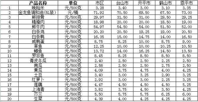 说明:1、表中价格为该地区监测点综合平均价;2、“市区”含蓬江区、江海区、新会区,价格分别采自蓬江市场、江南市场、城东市场等13家农贸市场;3、其他四个县市价格分别采自新华市场、锦江市场等8家农贸市场。