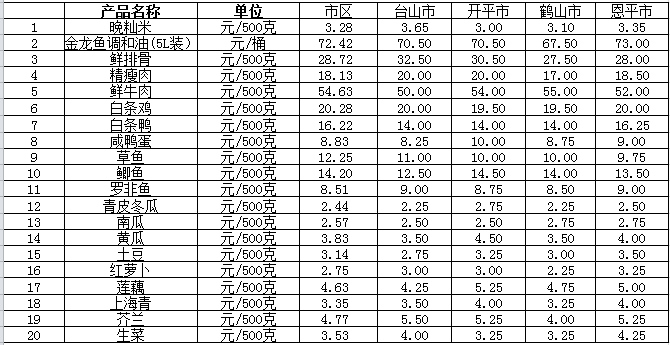 说明:1、表中价格为该地区监测点综合平均价;2、“市区”含蓬江区、江海区、新会区,价格分别采自蓬江市场、江南市场、城东市场等13家农贸市场;3、其他四个县市价格分别采自新华市场、锦江市场等8家农贸市场。