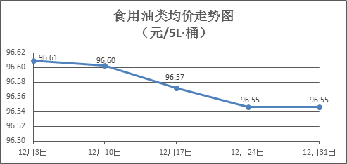 食用油类商品价格微幅波动。上周所监测的9种食用油(5L装)商品价格波动情况为2涨3跌4平,综合零售均价为96.55元/桶,环比持平。其中:鲁花花生油、大豆油零售均价分别为每桶157.13元、60.23元,环比分别上涨0.06%、下降0.10%。