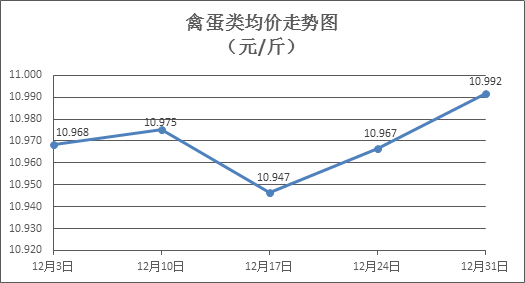 家禽类商品价格小幅上涨。上周所监测的6种禽蛋类商品价格波动情况为2涨1跌3平,综合零售均价为10.992元/斤,环比上涨0.23%。其中:白条鸡、白条鸭零售均价分别为每斤19.85元、15.44元,环比分别上涨0.81%、上涨0.19%;白壳鸡蛋、鸭蛋零售均价分别为每斤6.77元、7.98元,环比分别持平、下降0.50%。