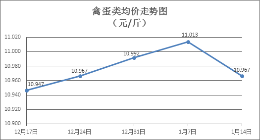 禽蛋类商品价格以降为主。上周所监测的6种禽蛋类商品价格波动情况为1涨5跌,综合零售均价为10.967元/斤,环比下降0.42%。其中:白条鸡、白条鸭零售均价分别为每斤20.09元、15.16元,环比分别下降0.25%、下降1.04%;白壳鸡蛋、鸭蛋零售均价分别为每斤6.76元、7.78元,环比分别下降0.15%、下降0.64%。