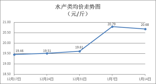 水产类商品价格微幅波动。上周所监测的10种水产商品价格波动情况为4涨6跌,综合均价为20.68元/斤,环比下降0.51%。其中:草鱼、鲫鱼、罗非鱼、基围虾零售均价分别为每斤11.10元、13.66元、8.64元、34.18元,环比分别上涨0.27%、下降0.94%、下降0.23%、上涨0.74%。