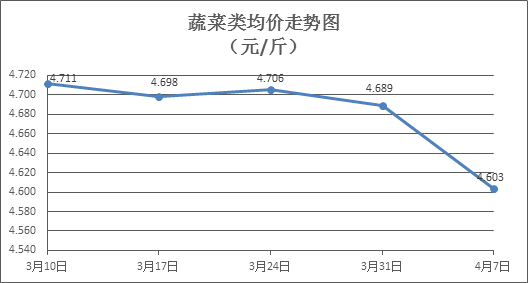 蔬菜类商品价格以降为主。所监测的32 种蔬菜商品价格波动情况为5涨22跌5平,综合零售均价为每斤4.603元,环比下降1.83%。其中:涨幅居前的品种包括花菜、青豆角、苦瓜,零售均价分别为每斤3.92元、6.78元、6.10元,环比分别上涨4.53%、2.73%、2.69%;跌幅靠前的品种包括丝瓜、水空心菜、奶白菜,零售均价分别为每斤5.90元、5.84元、4.48元,环比分别下降13.11%、11.38%、4.68%。