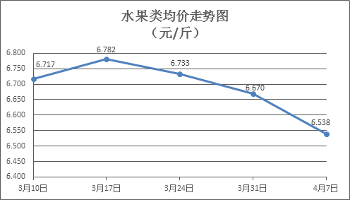 水果类商品价格小幅波动。所监测的6种水果商品价格波动情况为3涨3跌,综合零售均价为每斤6.538元,环比下降1.97%。其中苹果、香蕉、梨零售均价分别为每斤7.42元、2.84元、6.19元,环比分别下降0.40%、上涨0.71%、下降0.80%。