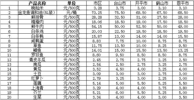说明:1、表中价格为该地区监测点综合平均价;2、“市区”含蓬江区、江海区、新会区,价格分别采自蓬江市场、江南市场、城东市场等13家农贸市场;3、其他四个县市价格分别采自新华市场、锦江市场等8家农贸市场。