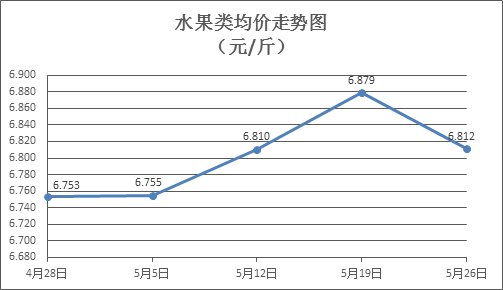水果类商品价格总体下调。所监测的6种水果商品价格波动情况为1涨5跌,综合零售均价为每斤6.812元,环比下降0.97%。其中橙子、苹果、香蕉零售均价分别为每斤5.64元、7.49元、2.77元,环比分别下降2.08%、下降0.40%、上涨0.36%。