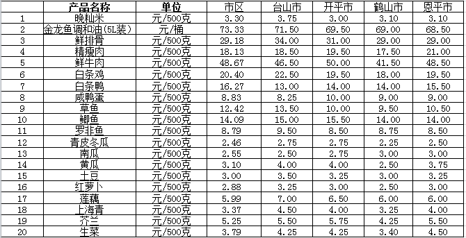 说明:1、表中价格为该地区监测点综合平均价;2、“市区”含蓬江区、江海区、新会区,价格分别采自蓬江市场、江南市场、城东市场等13家农贸市场;3、其他四个县市价格分别采自新华市场、锦江市场等8家农贸市场。