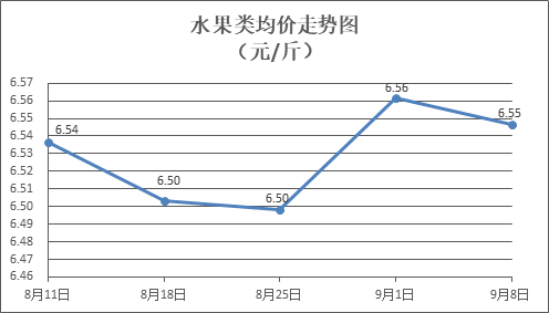水果类商品价格窄幅盘整。所监测的6种水果商品价格波动情况为3涨3跌,综合零售均价为每斤6.55元,环比下降0.23%。其中橙子、苹果、梨零售均价分别为每斤6.05元、7.48元、5.71元,环比分别上涨1.68%、下降0.66%、下降0.17%。