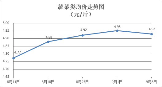 蔬菜类商品价格升降互现。所监测的32 种蔬菜商品价格波动情况为16涨14跌2平,综合零售均价为每斤4.93元,环比下降0.44%。其中:涨幅居前的品种包括菠菜、白苋菜、水空心菜,零售均价分别为每斤6.85元、4.52元、4.09元,环比分别上涨4.10%、2.96%、2.51%;跌幅靠前的品种包括青豆角、莴笋、苦瓜,零售均价分别为每斤5.37元、4.81元、4.88元,环比分别下降8.05%、7.50%、5.24%。