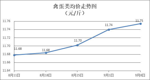 禽蛋类商品价格微幅上涨。所监测的5种禽蛋类商品价格波动情况为4涨1跌,综合零售均价为每斤11.75元,环比上涨0.12%。其中:白条鸡、白条鸭零售均价分别为每斤20.10元、15.36元,环比分别上涨0.05%、上涨0.26%;白壳鸡蛋、鸭蛋零售均价分别为每斤6.49元、7.75元,环比分别下降0.46%、上涨0.26%。