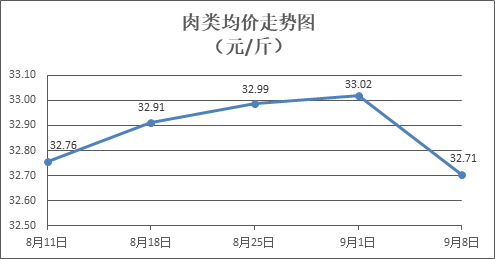 肉类商品价格总体略降。所监测的8种肉类商品价格波动情况为2涨5跌1平,综合零售均价为每斤32.71元,环比下降0.95%。其中:排骨、精瘦肉、牛肉、带骨羊肉零售均价分别为每斤32.78元、20.30元、45.52元、41.20元,环比分别下降0.88%、下降0.25%、上涨0.13%、下降5.00%。
