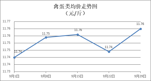 禽蛋类商品价格小幅波动。所监测的5种禽蛋类商品价格波动情况为2涨1跌2平,综合零售均价为每斤11.76元,环比上涨0.14%。其中:白条鸡、白条鸭零售均价分别为每斤20.21元、15.32元,环比分别上涨0.20%、持平;鸡蛋、鸭蛋零售均价分别为每斤6.54元、7.72元,环比分别持平、上涨1.18%。