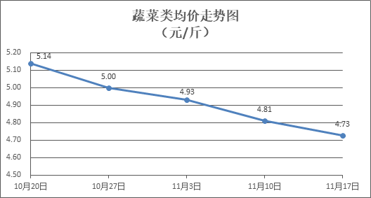 蔬菜类商品价格整体下降。所监测的32 种蔬菜商品价格波动情况为8涨21跌3平,综合零售均价为每斤4.73元,环比下降1.66%。其中:涨幅居前的品种包括白苋菜、水空心菜、土豆,零售均价分别为每斤4.44元、4.14元、3.04元,环比分别上涨2.07%、1.47%、1.33%;跌幅靠前的品种包括花菜、菠菜、西洋菜,零售均价分别为每斤5.33元、5.91元、4.84元,环比分别下降10.72%、9.63%、5.84%。