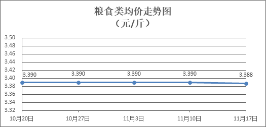 粮食类商品价格基本平稳。所监测的4种粮食类商品价格波动情况为1跌3平,零售均价为每斤3.388元。其中:油粘米、富强粉零售均价分别为每斤3.51元、3.36元,环比分别下降0.28%、持平。