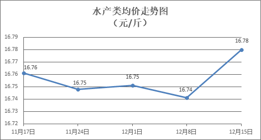 水产类商品价格总体略涨。所监测的9种水产商品价格波动情况为7涨2跌,综合均价为每斤16.78元,环比上涨0.23%。其中:草鱼、鲫鱼、罗非鱼、鳙鱼、基围虾零售均价分别为每斤11.07元、14.10元、9.09元、10.84元、29.64元,环比分别上涨0.54%、上涨1.15%、上涨0.33%、下降0.09%、下降0.80%。