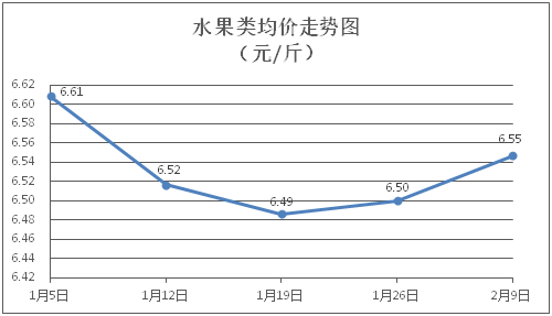 水果类商品价格稳中略涨。所监测的6种水果商品价格波动情况为3涨3平,综合零售均价为每斤6.55元,环比上涨0.72%。其中橙子、香蕉、葡萄零售均价分别为每斤5.85元、3.22元、13.63元,环比分别上涨1.74%、持平、上涨0.07%。