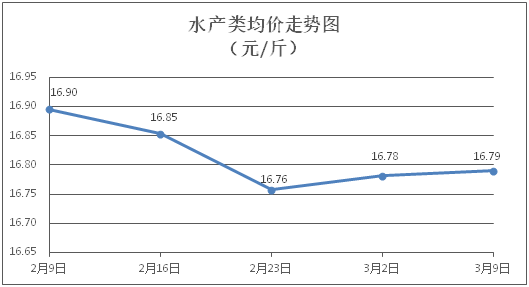 水产类商品价格微幅波动。所监测的9种水产商品价格波动情况为5涨3跌1平,综合均价为每斤16.79元,环比上涨0.05%。其中:草鱼、鲫鱼、鳙鱼、罗非鱼、基围虾零售均价分别为每斤11.00元、14.39元、10.74元、9.14元、30.12元,环比分别下降0.63%、上涨0.63%、下降0.74%、上涨0.11%、上涨0.17%。