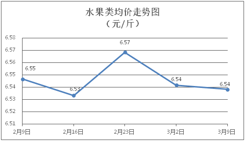 水果类商品价格弱势盘整。所监测的6种水果商品价格波动情况为2涨1跌3平,综合零售均价为每斤6.54元,环比下降0.05%。其中橙子、香蕉、葡萄零售均价分别为每斤5.97元、3.17元、13.68元,环比分别上涨0.17%、上涨0.63%、下降0.36%。