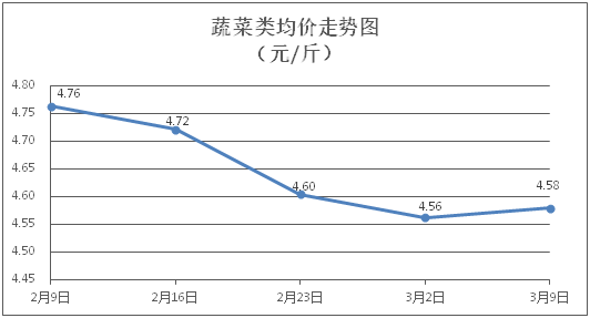 据本市21家农贸市场监测数据显示,上周(3月3日至3月10日)市场上各类“菜篮子”商品供应充足,所监测的7大类“菜篮子”商品价格环比总体表现为2涨4跌1平。其中:粮油类商品价格基本平稳,肉禽蛋类商品价格总体略降,蔬果类、水产类价格窄幅盘整。