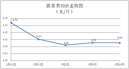 据本市21家农贸市场监测数据显示,上周(3月10日至3月16日)市场上各类“菜篮子”商品供应充足,所监测的7大类“菜篮子”商品价格环比总体表现为2涨5跌。其中:粮食类商品价格基本平稳,食用油类、水果类商品价格略有上涨,肉禽蛋类商品价格总体略降,蔬菜类、水产类价格窄幅盘整。