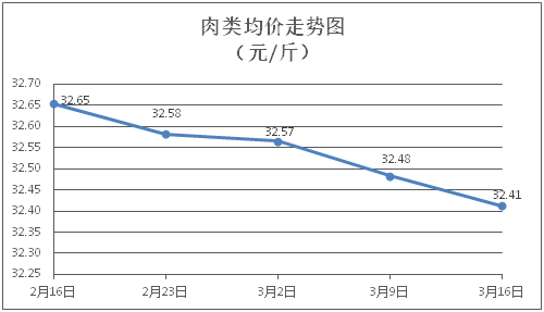 肉类商品价格继续微降。所监测的8种肉类商品价格波动情况为2涨6跌,综合零售均价为每斤32.41元,环比下降0.22%。其中:排骨、精瘦肉、牛肉、带骨羊肉零售均价分别为每斤31.43元、19.67元、46.49元、40.94元,环比分别下降0.06%、下降0.56%、下降0.36%、下降0.46%。
