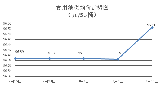 食用油类商品价格总体微涨。所监测的9种食用油(5L装)商品价格波动情况为6涨3跌,综合零售均价为每桶96.51元,环比上涨0.13%。其中:鲁花花生油、金龙鱼调和油零售均价为每桶155.83元、72.11元,环比分别下降0.13%、上涨0.15%。