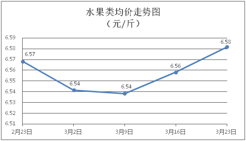 水果类商品价格微幅上涨。所监测的6种水果商品价格波动情况为3涨2跌1平,综合零售均价为每斤6.58元,环比上涨0.36%。其中橙子、苹果、葡萄零售均价分别为每斤6.14元、7.53元、13.78元,环比分别上涨2.16%、上涨0.27%、上涨0.22%。