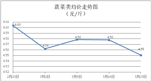 蔬菜类商品价格以降为主。所监测的32 种蔬菜商品价格波动情况为10涨17跌5平,综合零售均价为每斤4.55元,环比下降0.59%。其中:涨幅居前的品种包括青豆角、生菜、花菜,零售均价分别为每斤6.67元、3.43元、3.99元,环比分别上涨7.58%、3.31%、2.84%;跌幅靠前的品种包括丝瓜、苦瓜、西红柿,零售均价分别为每斤5.74元、6.05元、4.17元,环比分别下降10.59%、6.49%、2.80%。