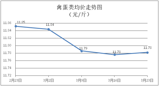 禽蛋类商品价格微幅波动。所监测的5种禽蛋类商品价格波动情况为2涨2跌1平,综合零售均价为每斤11.78元,环比上涨0.05%。其中:白条鸡、白条鸭零售均价分别为每斤20.58元、15.24元,环比分别持平、上涨0.33%;鸡蛋、鸭蛋零售均价分别为每斤6.36元、7.57元,环比分别下降0.31%、下降0.26%。