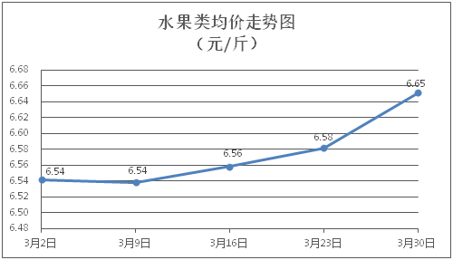 水果类商品价格小幅上涨。所监测的6种水果商品价格波动情况为5涨1平,综合零售均价为每斤6.65元,环比上涨1.06%。其中橙子、苹果、葡萄零售均价分别为每斤6.17元、7.55元、13.93元,环比分别上涨0.49%、上涨0.27%、上涨1.09%。