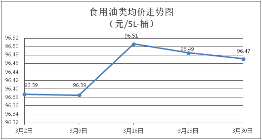 食用油类商品价格稳中微降。所监测的9种食用油(5L装)商品价格波动情况为4跌5平,综合零售均价为每桶96.47元,环比下降0.01%。其中:鲁花花生油、金龙鱼调和油零售均价为每桶155.83元、72.04元,环比分别持平、下降0.04%。