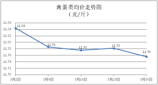 禽蛋类商品价格窄幅盘整。所监测的5种禽蛋类商品价格波动情况为1涨3跌1平,综合零售均价为每斤11.76元,环比下降0.22%。其中:白条鸡、白条鸭零售均价分别为每斤20.55元、15.16元,环比分别下降0.15%、下降0.52%;鸡蛋、鸭蛋零售均价分别为每斤6.32元、7.57元,环比分别下降0.63%、持平。
