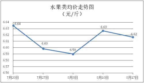 水果类商品价格窄幅盘整。所监测的6种水果商品价格波动情况为1涨2跌3平,综合零售均价为每斤6.62元,环比下降0.15%。其中橙子、香蕉、西瓜零售均价分别为每斤6.86元、3.25元、3.04元,环比分别持平、下降1.22%、上涨1.00%。