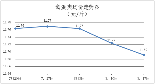 禽蛋类商品价格微幅下降。所监测的5种禽蛋类商品价格波动情况为3跌2平,综合零售均价为每斤11.69元,环比下降0.27%。其中:白条鸡、白条鸭零售均价分别为每斤20.69元、15.21元,环比分别下降0.39%、持平;鸡蛋、鸭蛋零售均价分别为每斤6.37元、7.08元,环比分别下降0.78%、持平。
