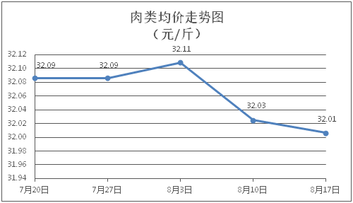 肉类商品价格微幅波动。所监测的8种肉类商品价格波动情况为3涨5跌,综合零售均价为每斤32.01元,环比下降0.06%。其中:排骨、精瘦肉、牛肉、带骨羊肉零售均价分别为每斤30.43元、18.90元、46.22元、42.22元,环比分别上涨0.13%、下降0.11%、下降0.13%、上涨0.17%。