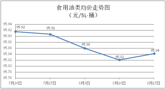 食用油类商品价格基本平稳。所监测的9种食用油(5L装)商品价格波动情况为1涨8平,综合零售均价为每桶95.84元,环比上涨0.02%。其中:金龙鱼花生油、大豆油零售均价分别为每桶102.62元、61.61元,环比分别持平、上涨0.31%。