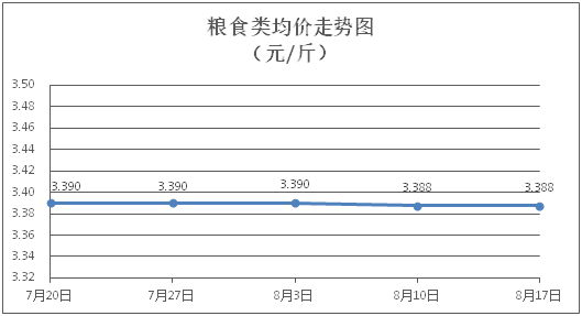 粮食类商品价格保持稳定。所监测的4种粮食类商品价格均持平,综合零售均价为每斤3.388元。其中:丝苗米、面粉零售均价分别为每斤3.51元、3.39元,环比均持平。