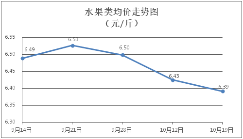 水果类商品价格升降互现。所监测的6种水果商品价格波动情况为2涨3跌1平,综合零售均价为每斤6.39元,环比下降0.52%。其中橙子、香蕉、西瓜零售均价分别为每斤7.41元、2.83元、3.17元,环比分别下降3.14%、下降1.74%、上涨2.59%。
