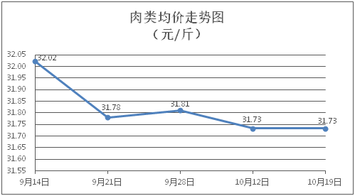 肉类商品价格窄幅盘整。所监测的8种肉类商品价格波动情况为3涨5跌,综合零售均价为每斤31.73元,环比下降0.004%。其中:排骨、精瘦肉、牛肉、带骨羊肉零售均价分别为每斤30.27元、18.45元、46.82元、39.80元,环比分别下降0.59%、下降0.22%、上涨0.15%、下降0.13%。