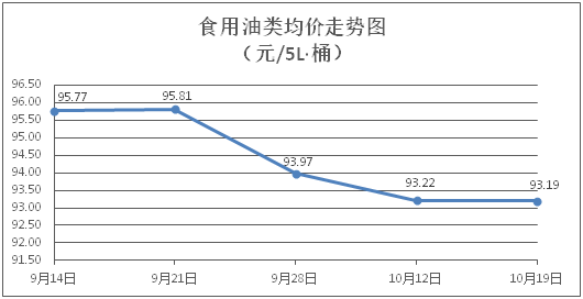 食用油类商品价格基本平稳。所监测的9种食用油(5L装)商品价格波动情况为1涨1跌7平,综合零售均价为每桶93.19元,环比下降0.03%。其中:金龙鱼花生油、金龙鱼调和油零售均价分别为每桶100.65元、70.46元,环比分别下降0.36%、上涨0.14%。
