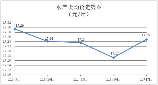 水产类商品价格小幅波动。所监测的水产商品价格波动情况为4涨5跌,综合均价为每斤17.25元,环比上涨0.45%。其中:黄花鱼、草鱼、鲫鱼、基围虾零售均价分别为每斤26.54元、11.36元、13.80元、28.21元,环比分别上涨0.45%、下降0.26%、上涨1.25%、下降0.28%。